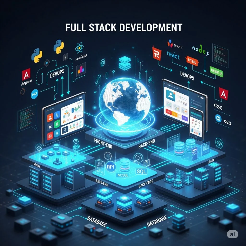 Full Stack Development refers to the comprehensive practice of developing both the frontend (client side) and backend (server side) of web or mobile applications. A full stack developer possesses the skills to work across the entire development process—from designing responsive, user-friendly interfaces using HTML, CSS, and JavaScript frameworks like React or Vue.js, to building robust server-side applications with technologies like Node.js, Python, PHP, or Ruby, and managing databases like MySQL, MongoDB, or PostgreSQL.